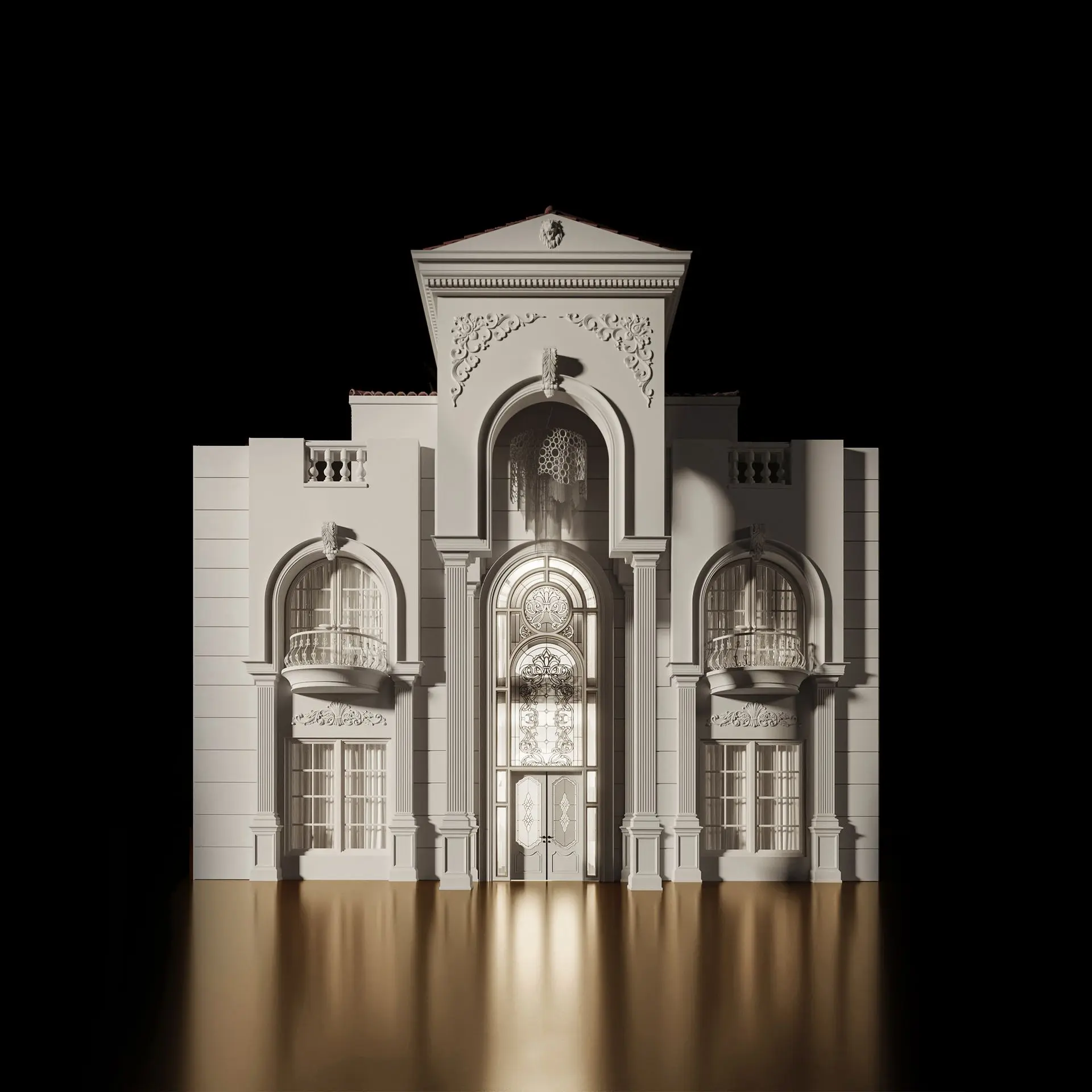 The facade is adorned with decorative elements, including floral motifs and detailed moldings, which add depth and texture to the design.