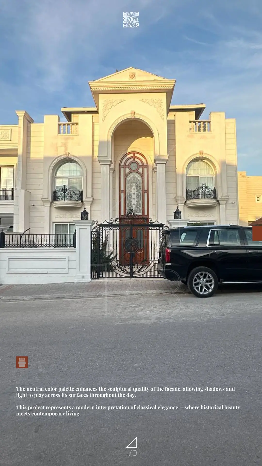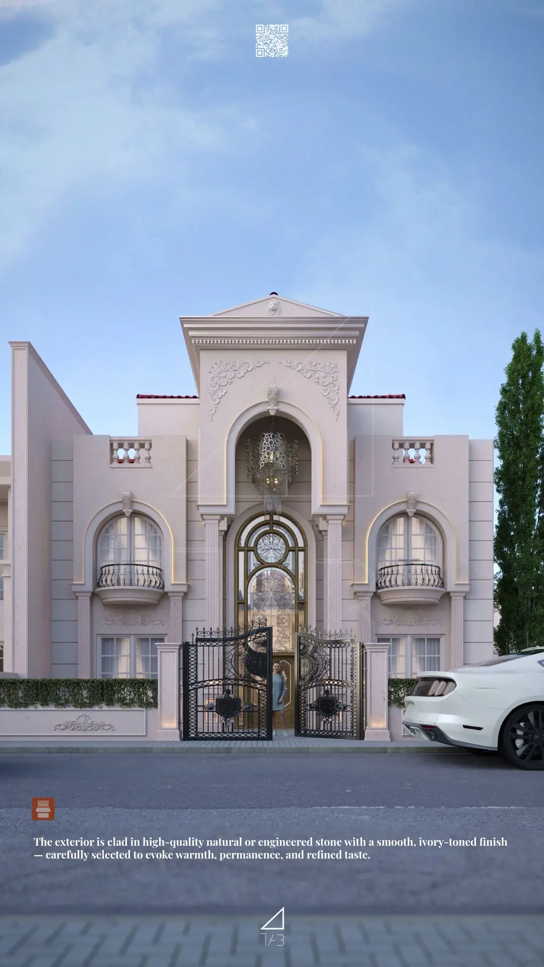 The villa a grand and elegant architectural design, blending classical and contemporary elements to create a visually stunning exterior.