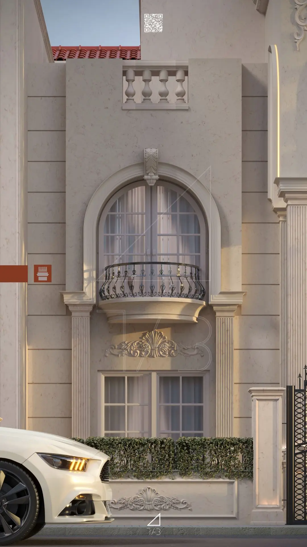 The small balconies with balustrades on either side of the entrance enhance the villa’s charm and provide functional outdoor spaces.
